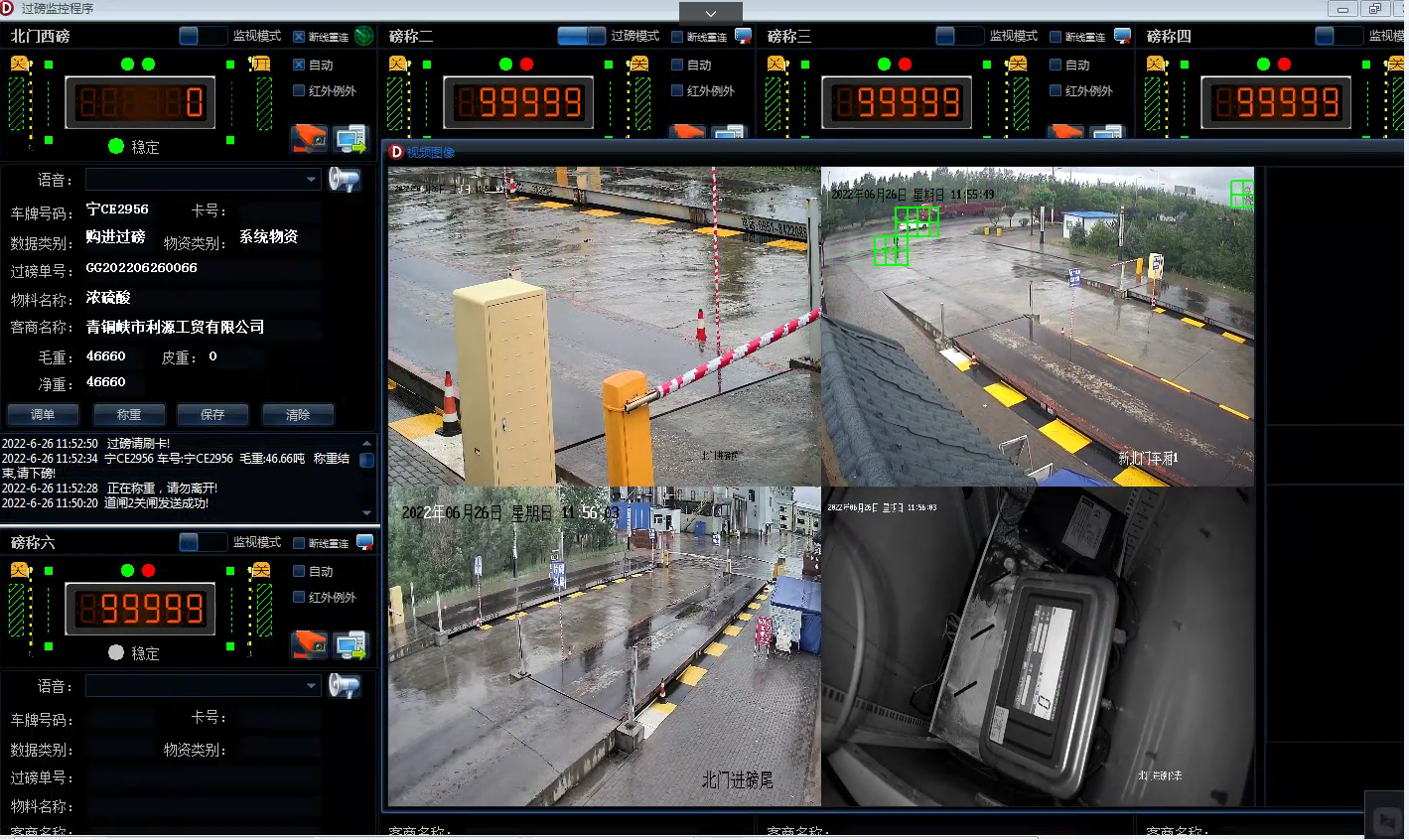 功能点:在地磅前、后、车厢、称重仪表安装四个高清网络摄像头,在称重的时候自动抓拍四幅图片与过磅业务数据绑定,并进行录相,方便数据进行追溯查询。