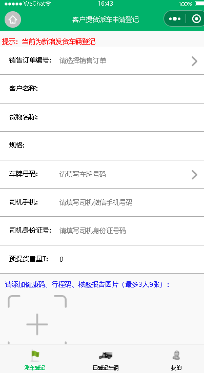 2. 车辆信息登记:客户利用微信小程序(或者网页客户端程序)参照ERP中销售订单,如销售订单信息存在,在系统中选择销售订单、货物资料、车牌号码、司机姓名、司机微信手机号码、司机身份证号预提重量等信息。如订单余量与派车计划不足则无法派车。